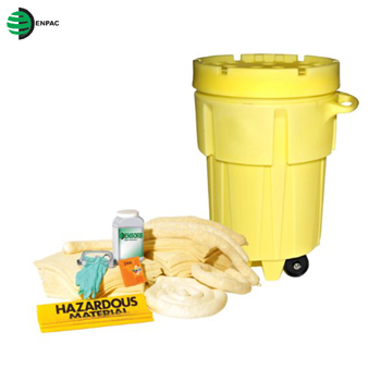 輪式泄漏處理桶套裝機動性當然好,可以非常方便快捷地及時反應。泄漏應急處理桶里包含相應的泄漏應急處理材料,分成吸油專用(油和碳氫化合物液體)、通用型(油、水和化學物質)和化學吸液型(化學品,腐蝕性液體和危險化學品)。條狀、片狀吸附棉按一定比例組合,加上ENPAC獨有的超強萬能型Ensorb吸附劑,再配備上相應的防護產品,使應對突發之泄漏更迅速有效。