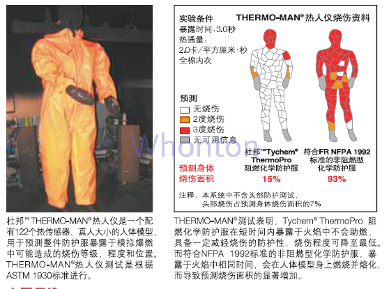 3、暴露在火焰中時(shí),Tychem ThermoPro防護(hù)服是阻燃的,增加了從爆燃中逃生的時(shí)間;
