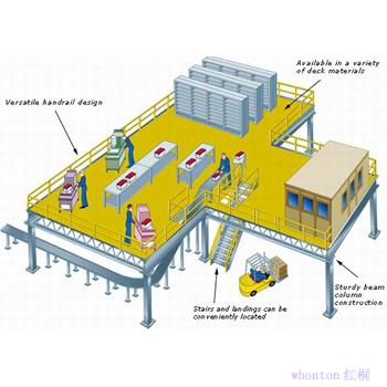 鋼平臺(tái)結(jié)構(gòu)主要有梁、柱、鋪板、欄桿及鋼梯組成;整體組裝,無(wú)須現(xiàn)場(chǎng)焊接。通常承載能力在200kg ~1000KG/米2,立柱選擇承載能力強(qiáng)、用鋼量少的管材;樓面鋪板選用冠帝專用特殊C型冷彎成型花紋鋼板或鏤空板,鋪板之間采用扣板式結(jié)構(gòu),與主次梁鋼性固定,整個(gè)平臺(tái)結(jié)構(gòu)整體性強(qiáng),可以根據(jù)實(shí)際需要選擇不同的樓面板以滿足消防或防灰塵、防小件墜落要求。樓面下方也可根據(jù)需要配置照明系統(tǒng)。貨物輸送可選擇液壓升降平臺(tái)、貨梯或叉車。所有材料均為優(yōu)質(zhì)碳素結(jié)構(gòu)鋼,全自動(dòng)表面噴塑防腐處理,承載性能優(yōu)越,外觀簡(jiǎn)潔、大方。廣泛應(yīng)用于各個(gè)行業(yè)。